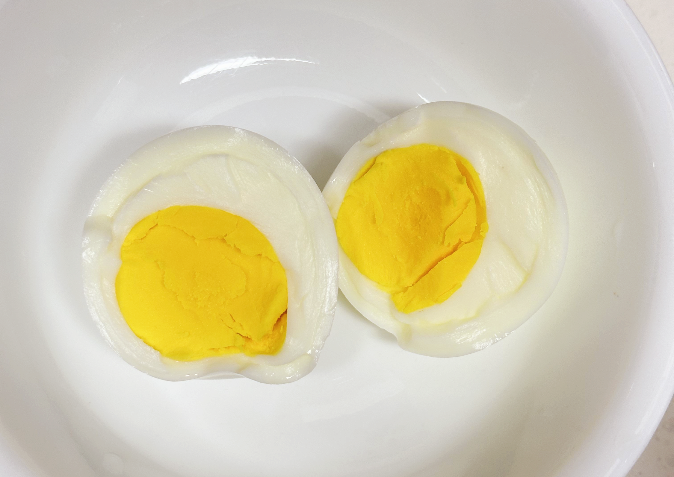 3차) 1,2차 때 다 잘 익어서 살짝 덜 익혀보려고 물을 부어 물온도 낮췄는데도 10분만 했다. 반숙에 가까웠고 계란이 아직 식기 전이라 더 그랬을 것 같긴 한데 흰자도 매우 부드러운 상태였다. (칼로 자른 단면 참조)